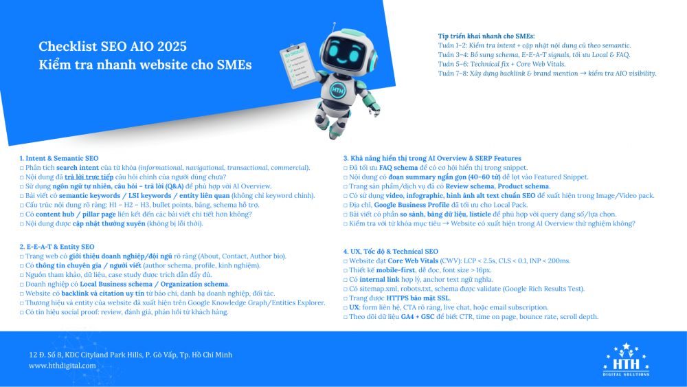 Nếu bạn đang muốn biết website của mình đã sẵn sàng cho kỷ nguyên SEO AI 2025 hay chưa, hãy thử ngay Checklist SEO AIO 2025 mà HTH Digital đã xây dựng. Checklist này giúp bạn nhanh chóng xác định: